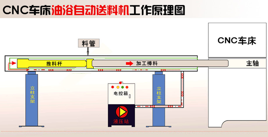 油液的阻尼反作用力,使棒料主動(dòng)懸浮在料管中心轉(zhuǎn)變。大大減少了磕碰與磨擦;液壓源動(dòng)力,作業(yè)噪音小,且送料動(dòng)作十分安穩(wěn)、陡峭;不一樣的料管運(yùn)用于不一樣直徑的資料,是資料與料管之間的空隙更合理,送料機(jī)更安穩(wěn)